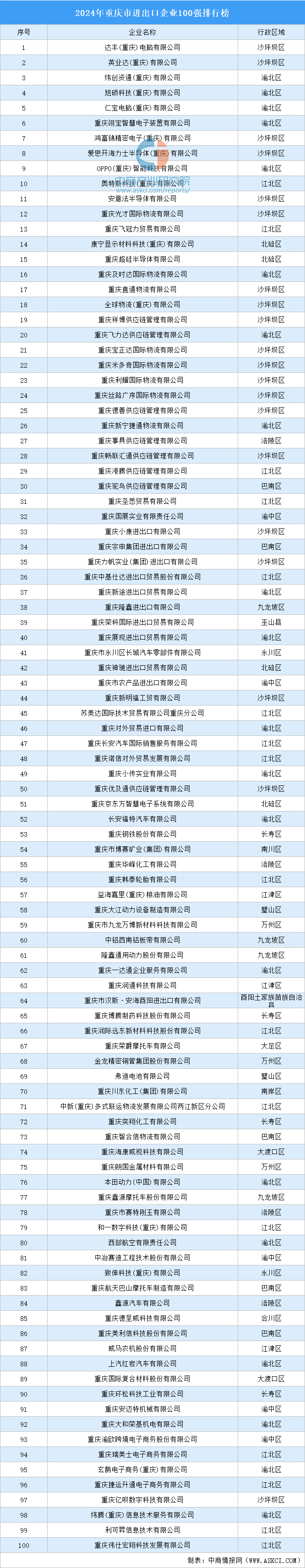 中商谍报网讯:3月13日,进出口商会2024年度会员大会暨“稳增量、提质量”外贸从题勾当举行,进出口企业100强榜单揭晓,进出口企业100强企业中,渝北区、沙坪坝区各上榜企业100家企业,江北区16家企业上榜,渝中区、巴南区各5家企业上榜。